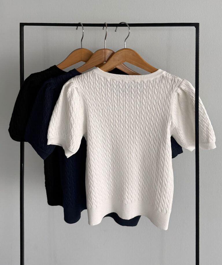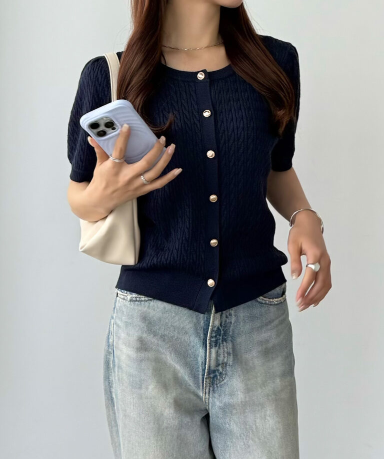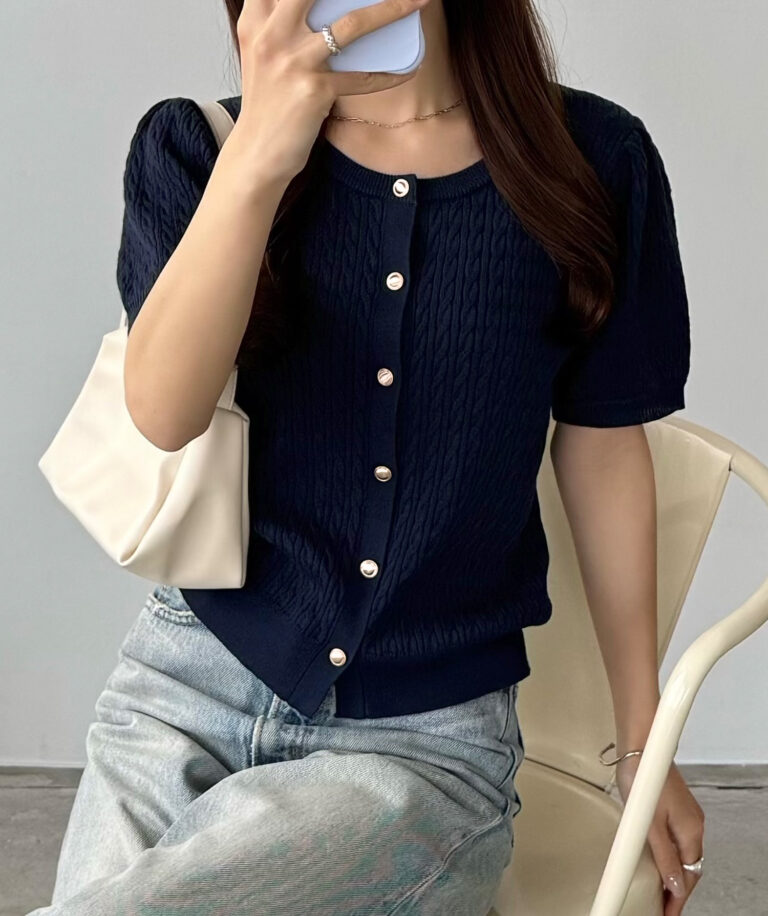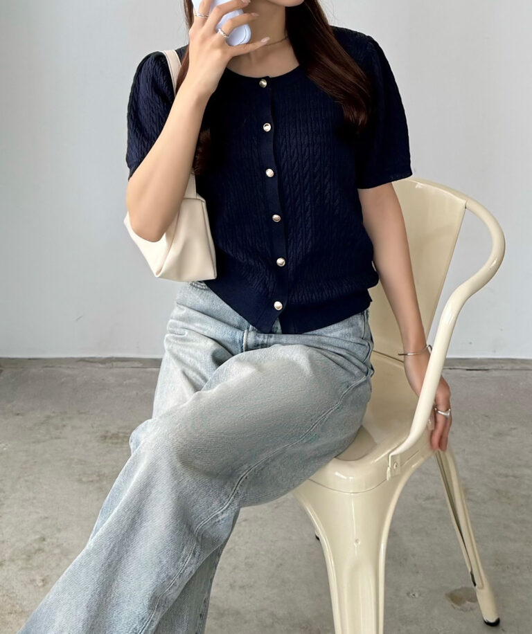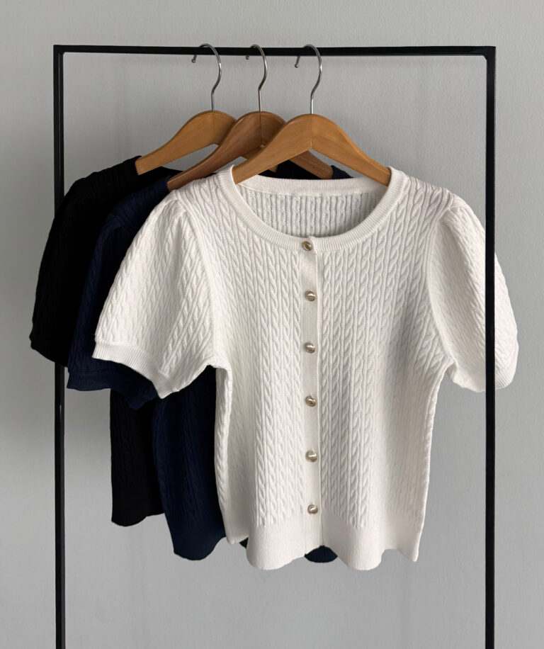 表情豊かなケーブル編みを施した半袖ニットカーディガン。