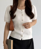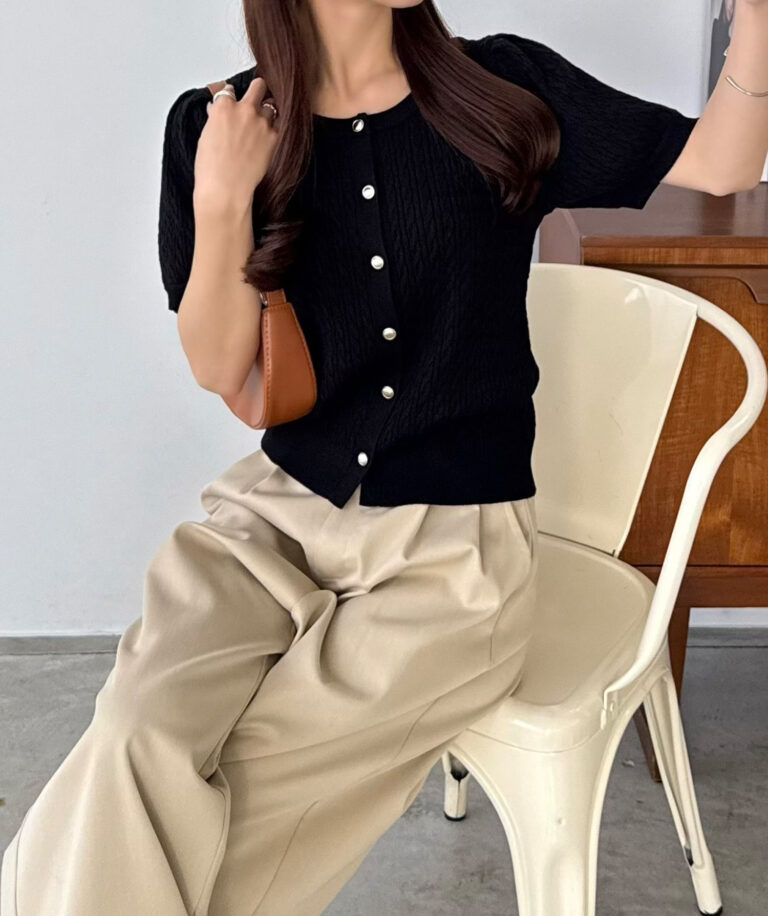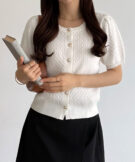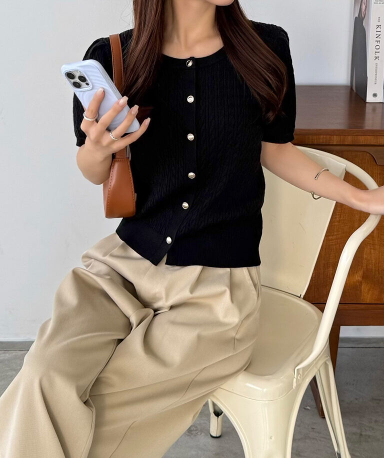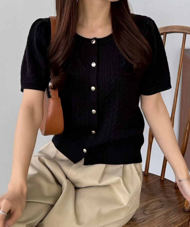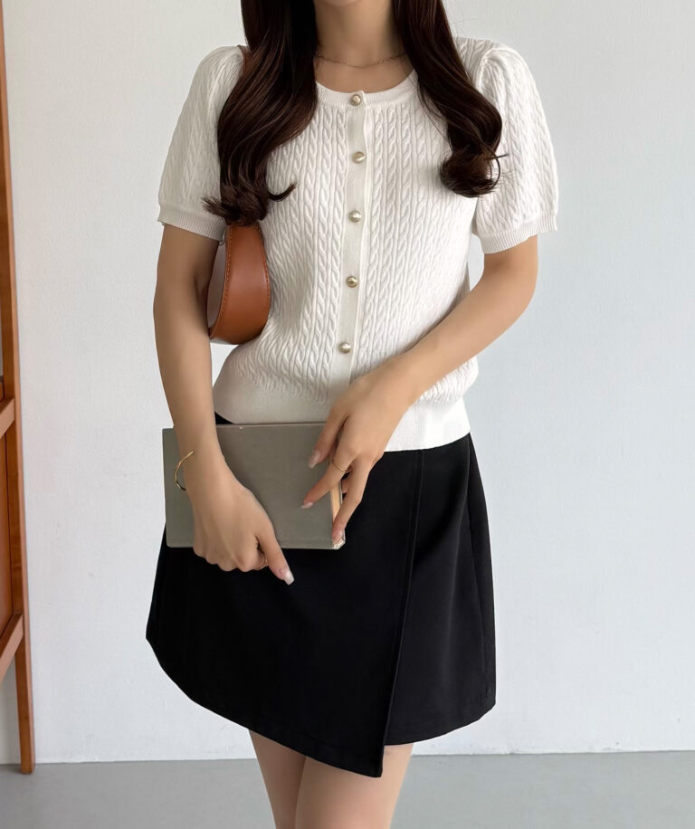 表情豊かなケーブル編みを施した半袖ニットカーディガン。