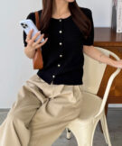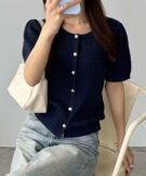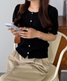 クラシカルな雰囲気ただよう金ボタンニットカーディガン。