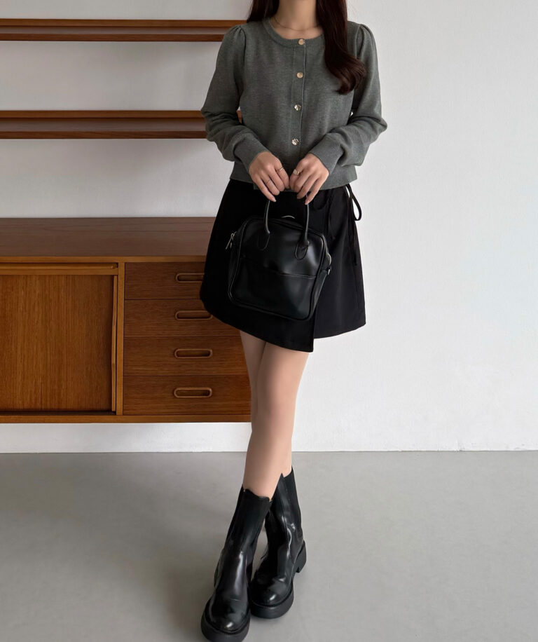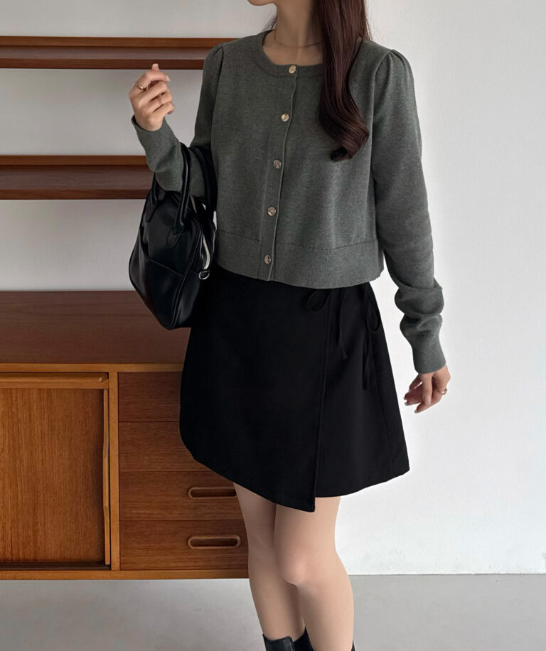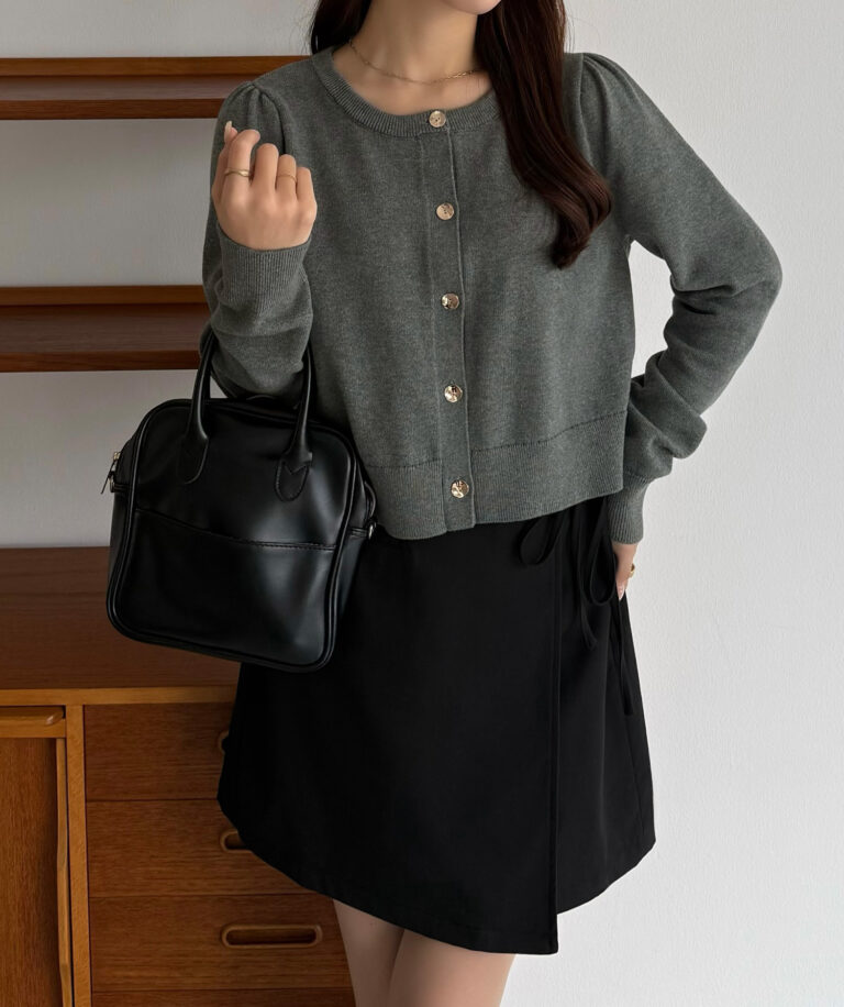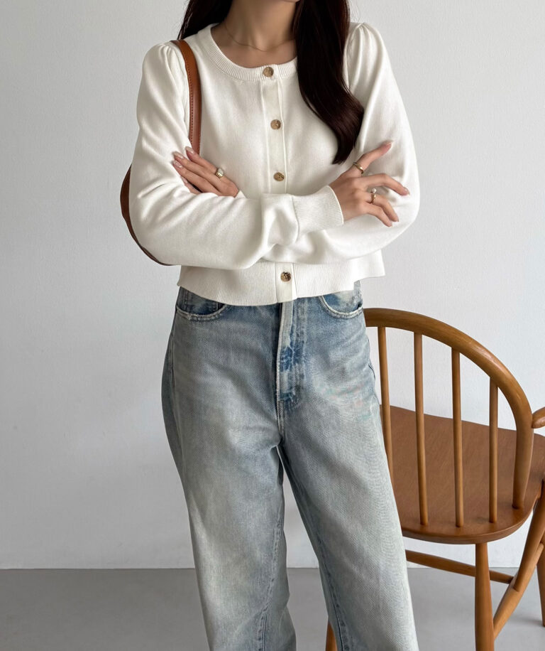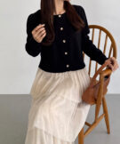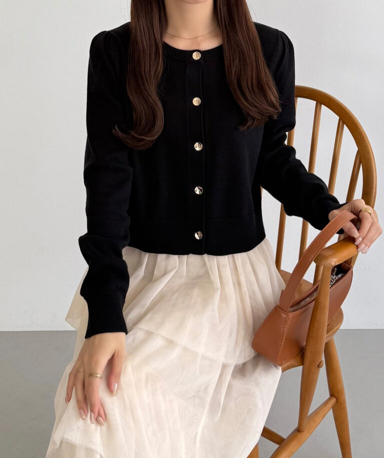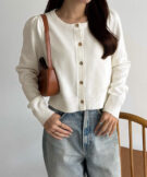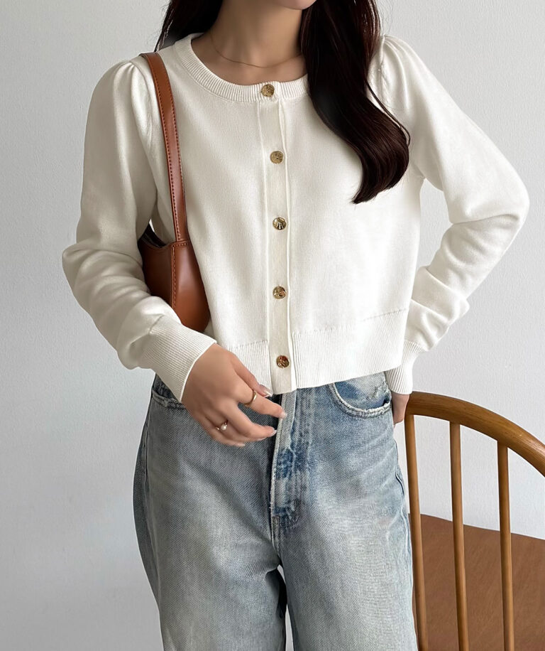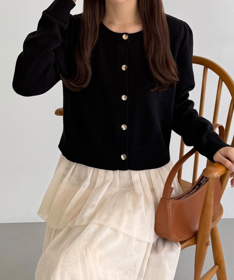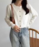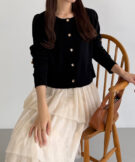 フロントに並べたゴールド釦が上品なニットカーディガン。