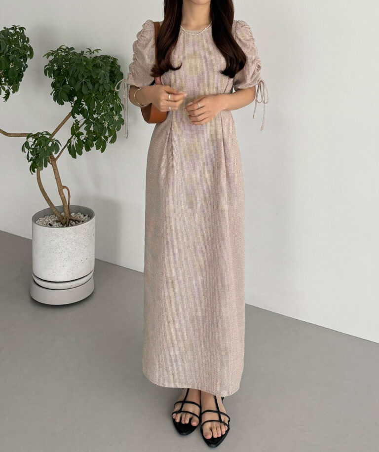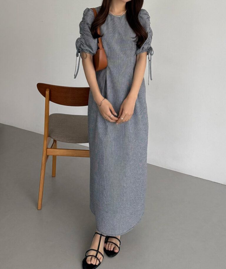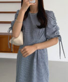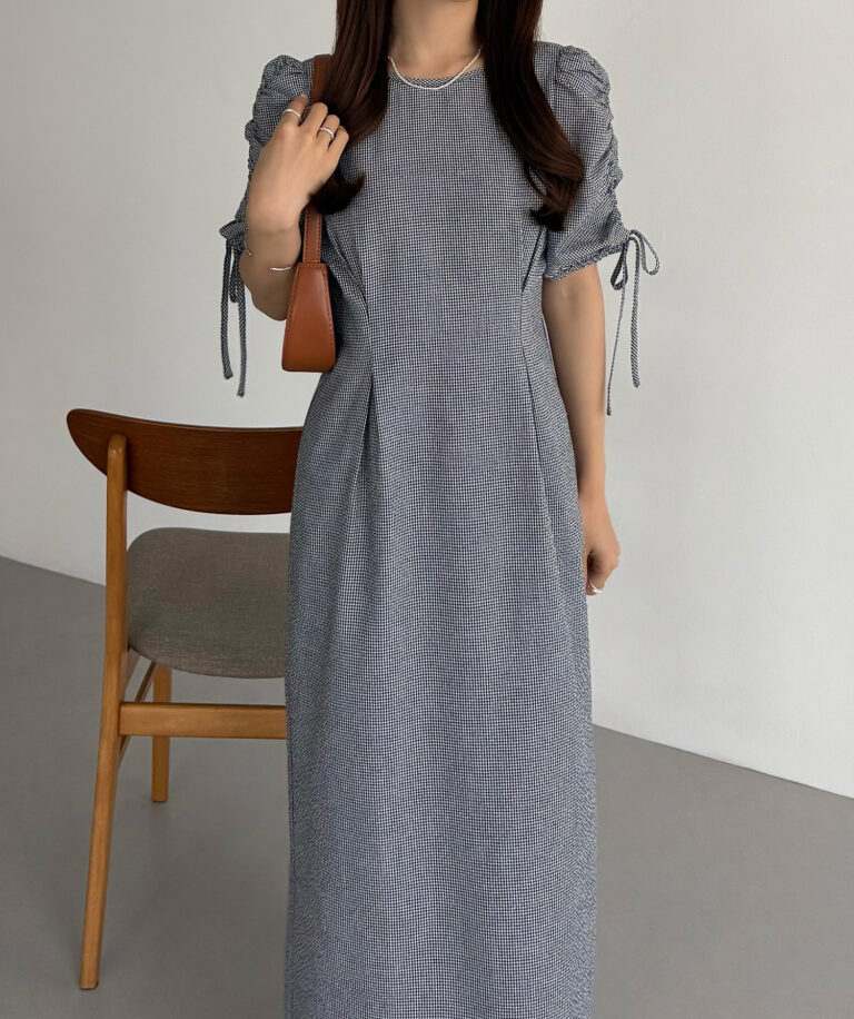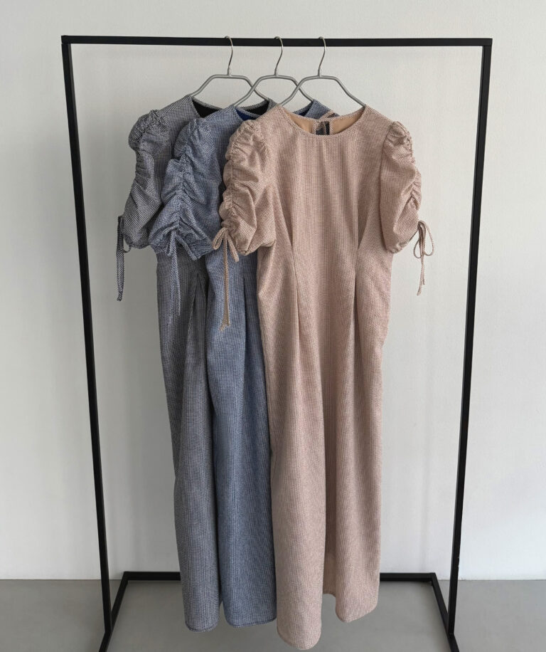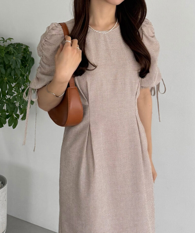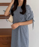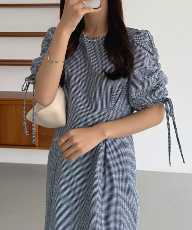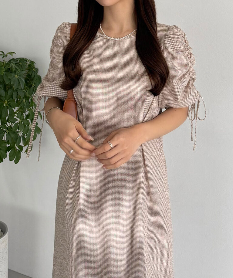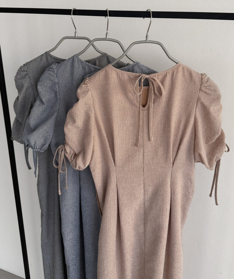チェック柄が大人かわいいパフスリーブリボンワンピース。