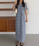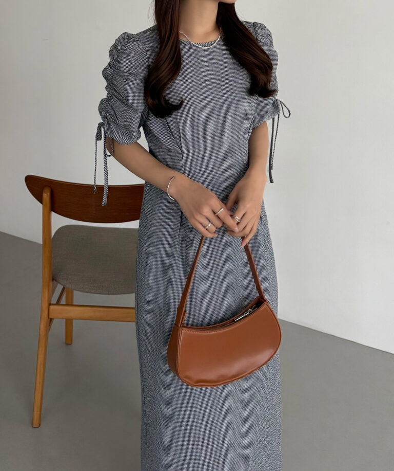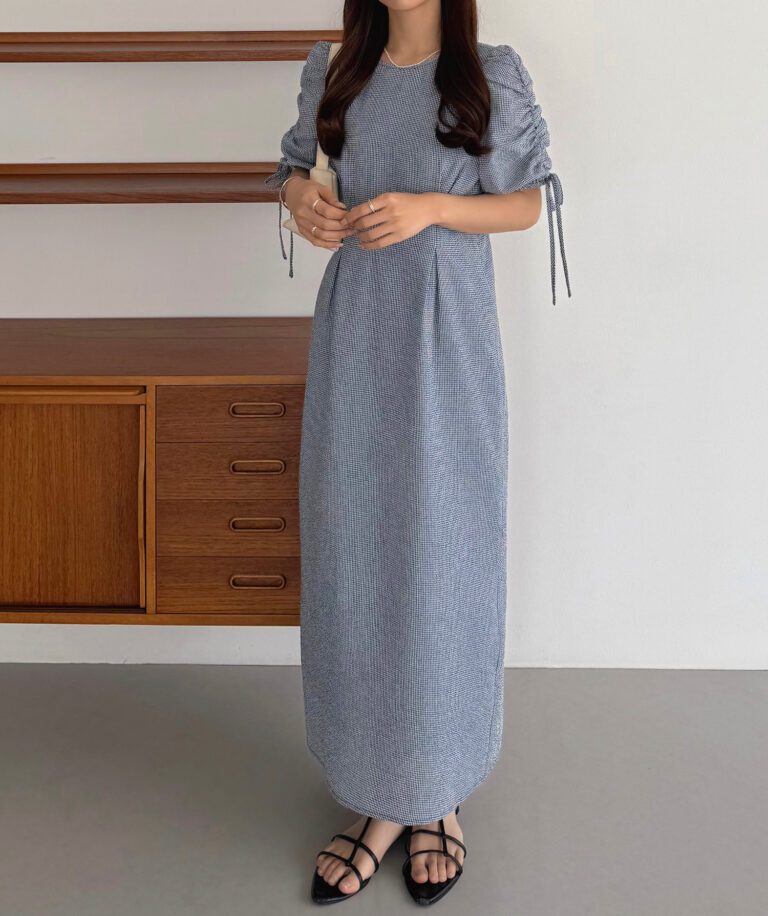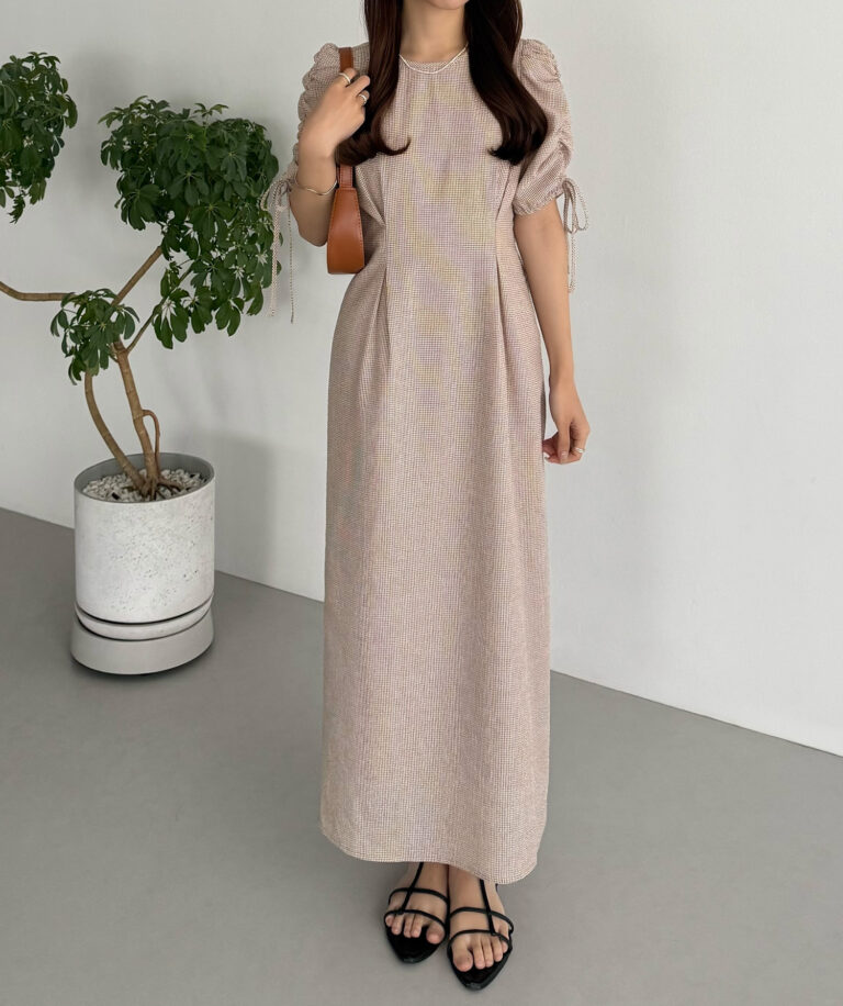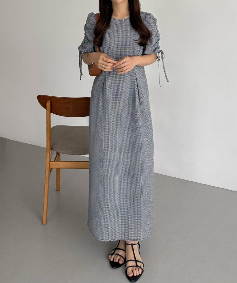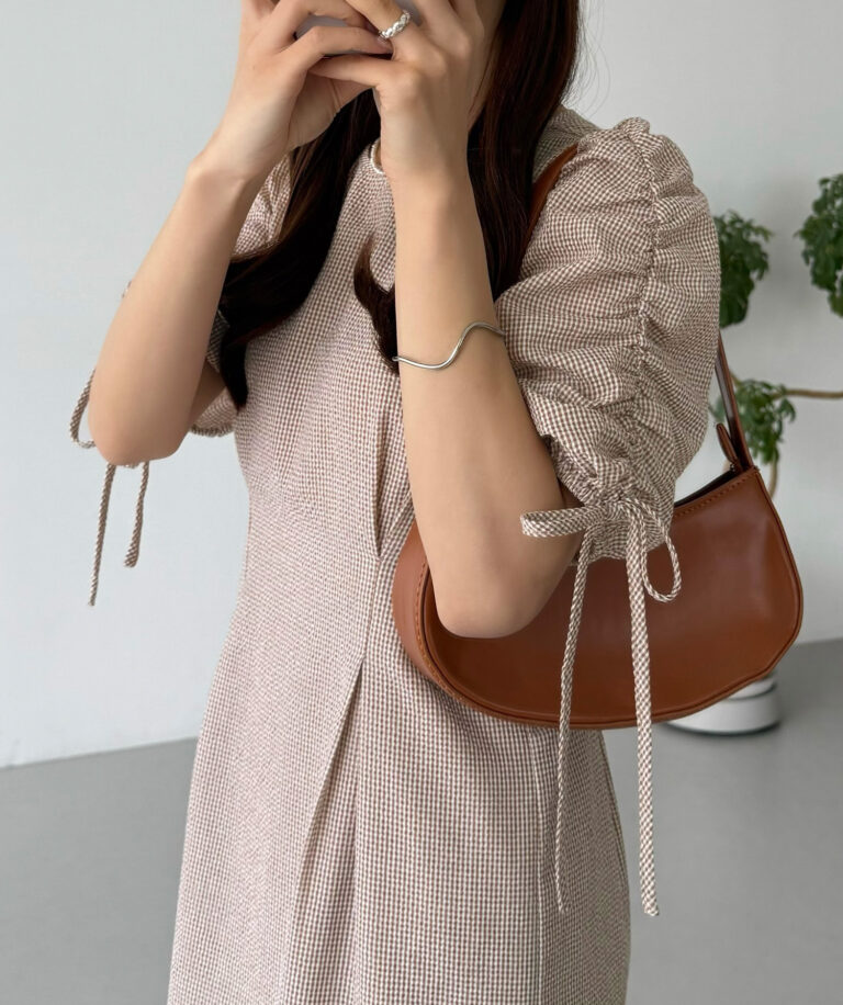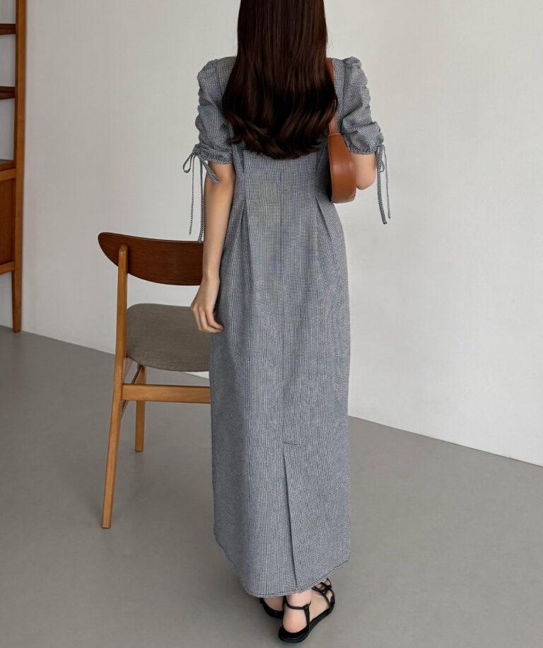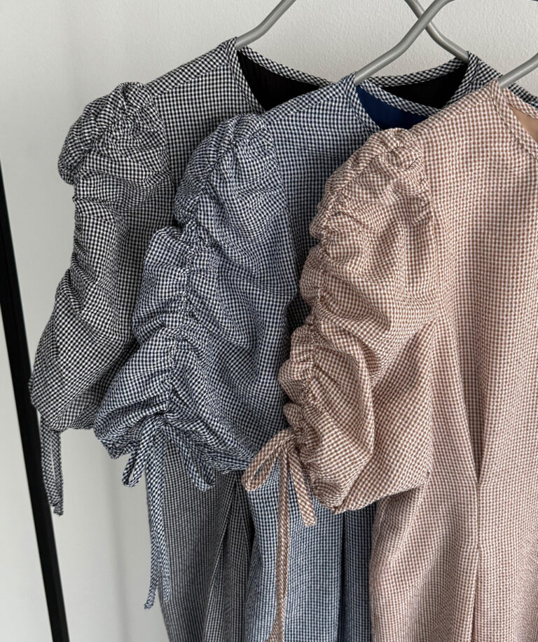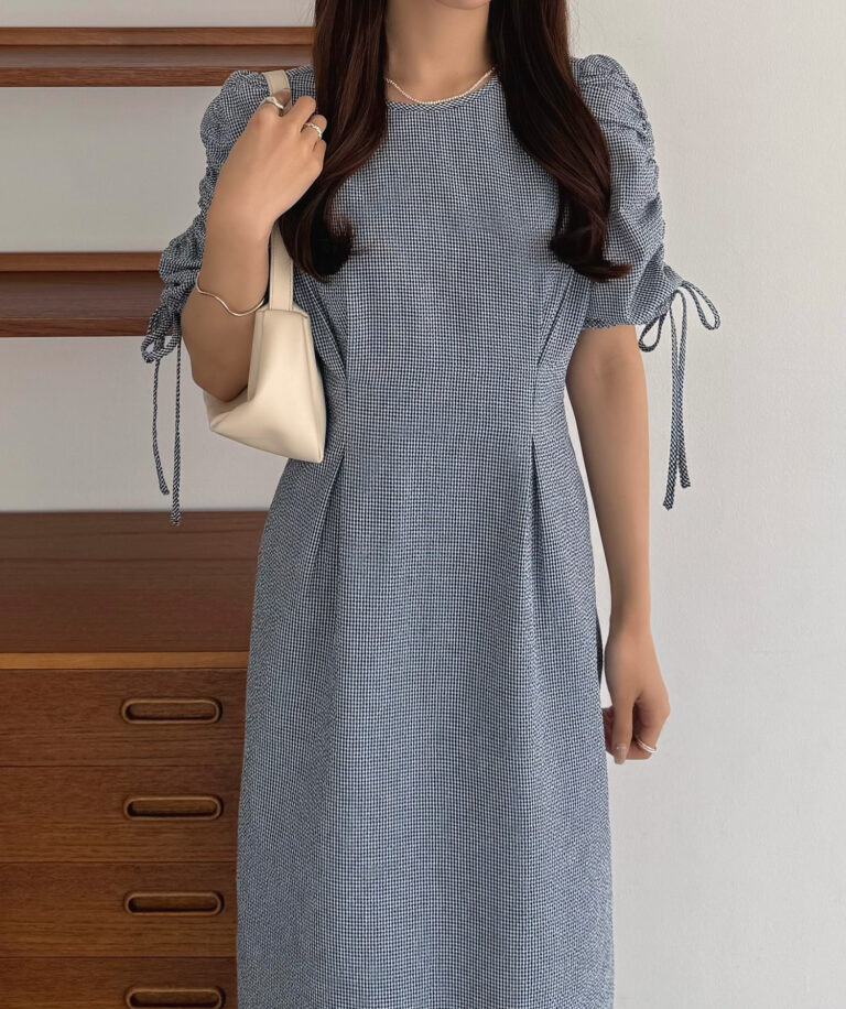 チェック柄が大人かわいいパフスリーブリボンワンピース。
