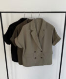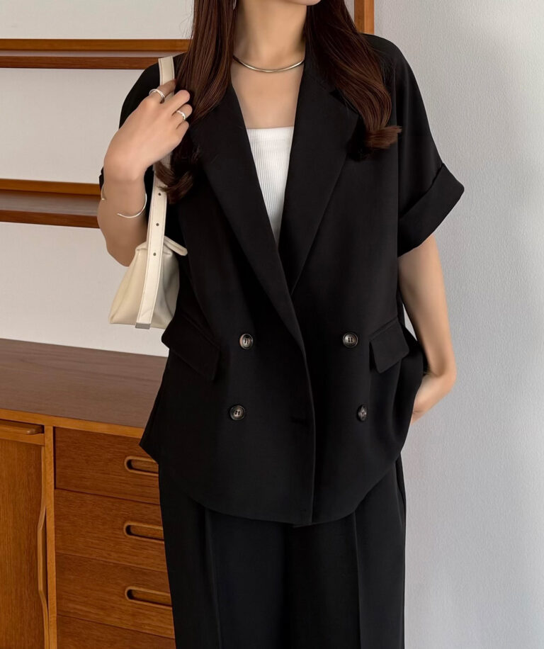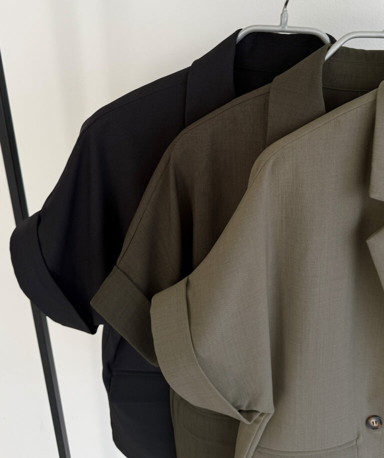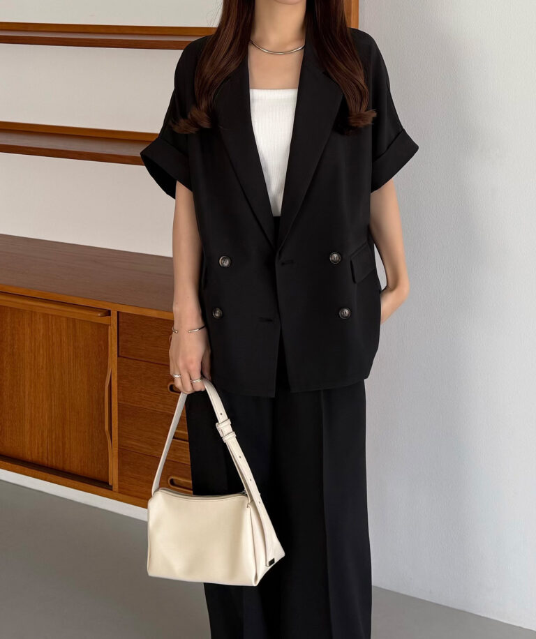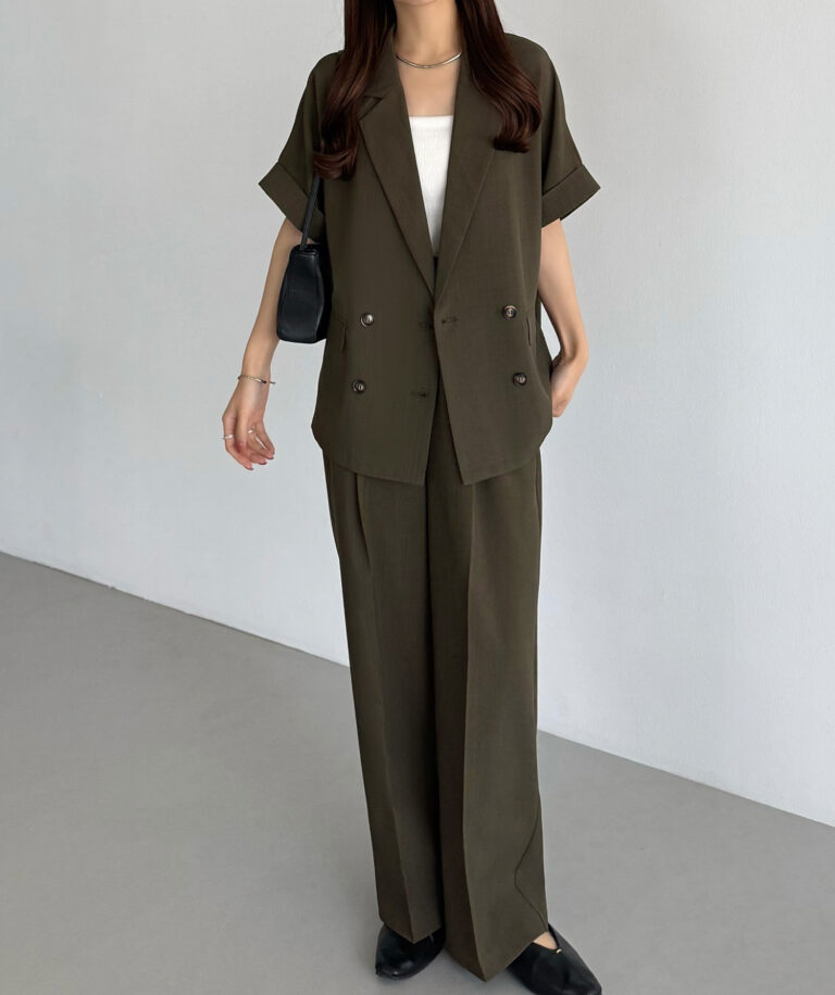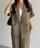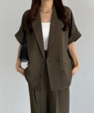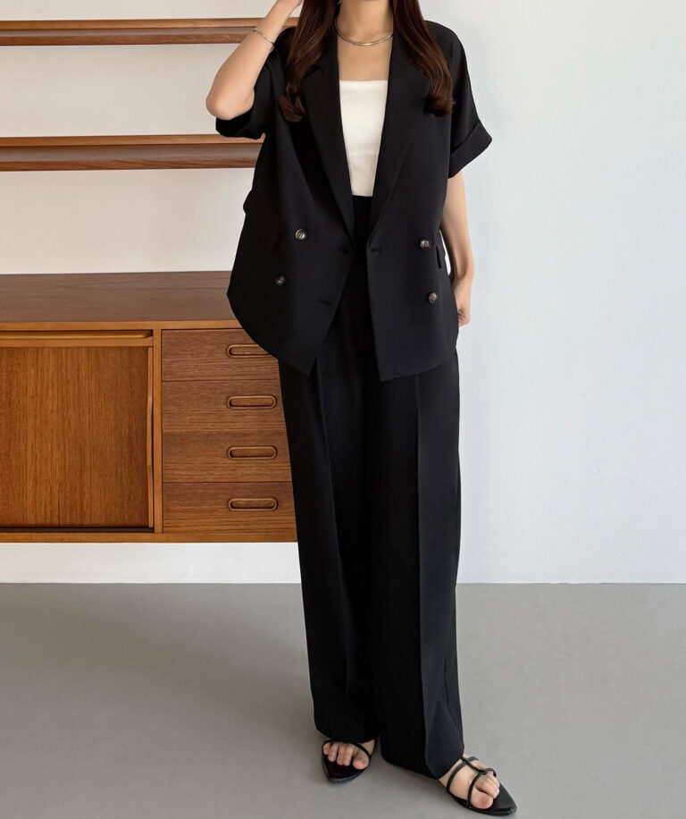 着回し力抜群、大人レディな半袖ジャケット×スラックスのセット。