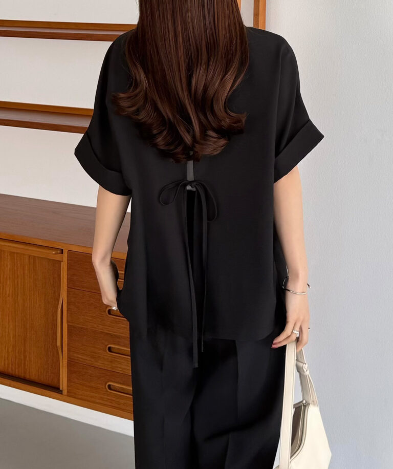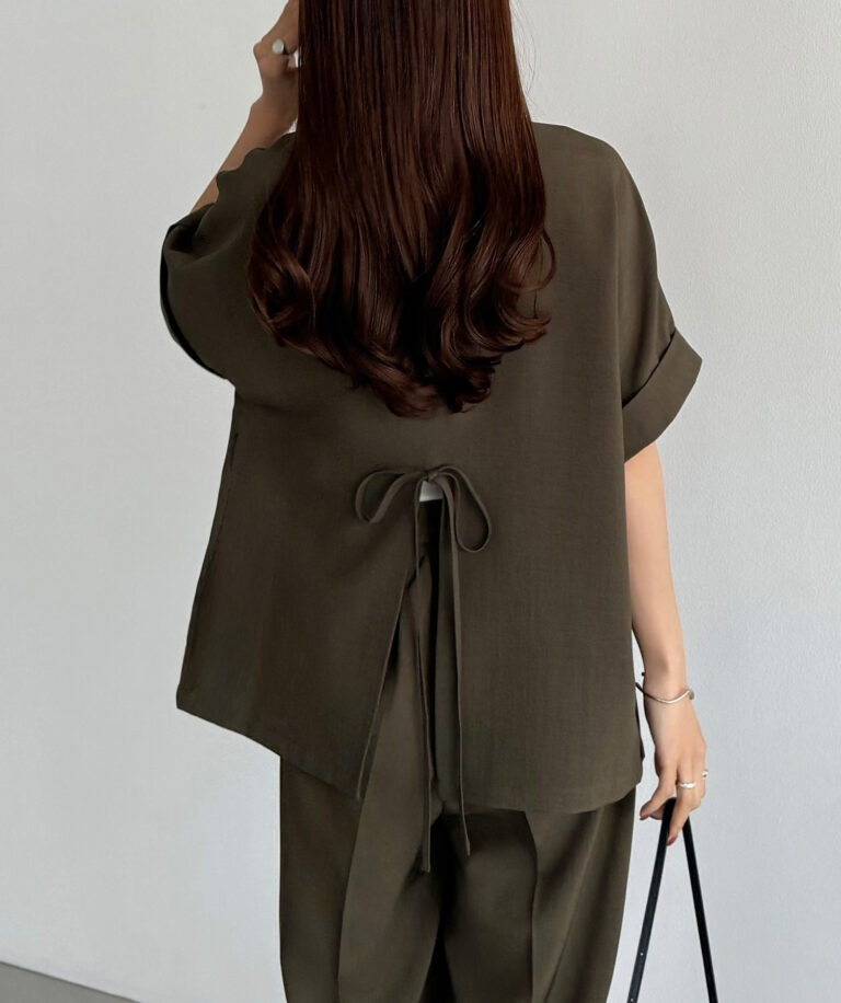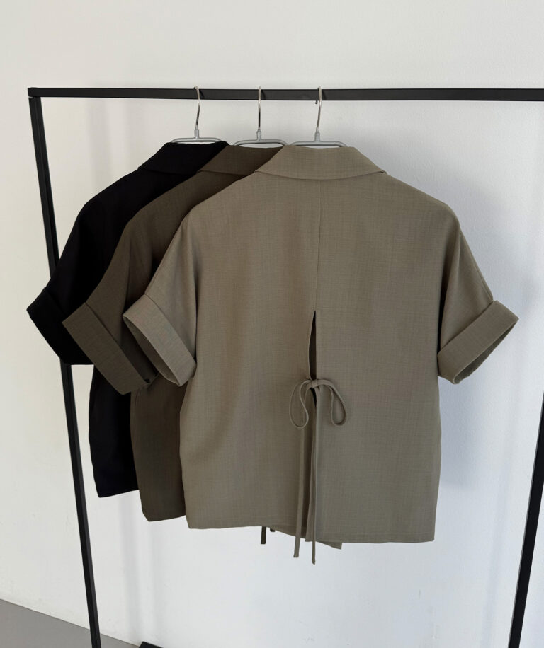 リボン×バックスリットデザインを施したひと癖半袖ジャケット。
