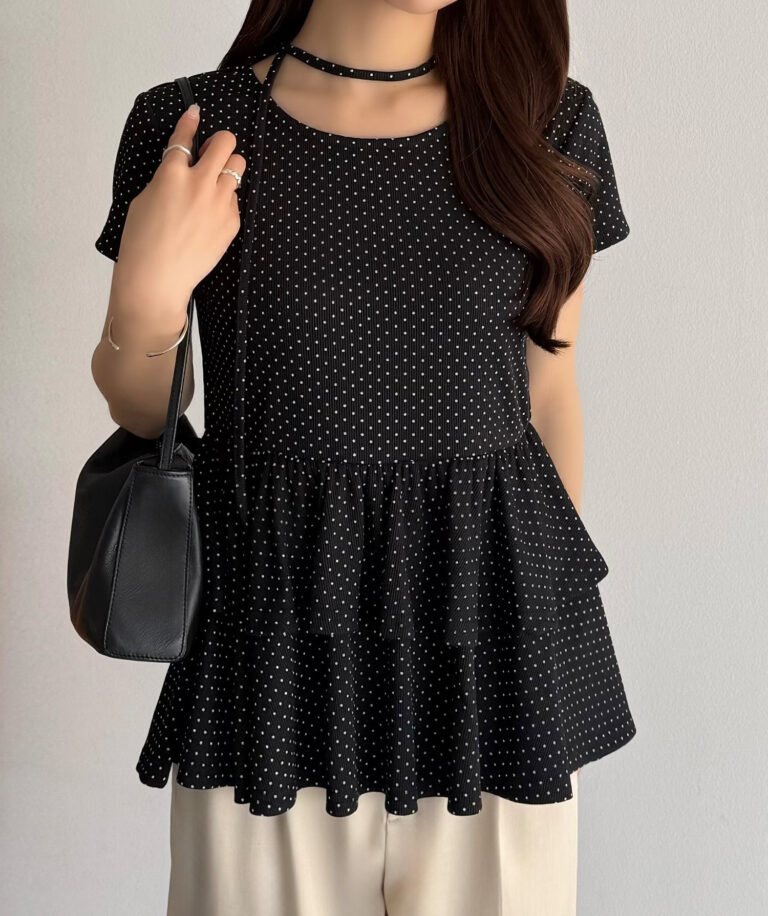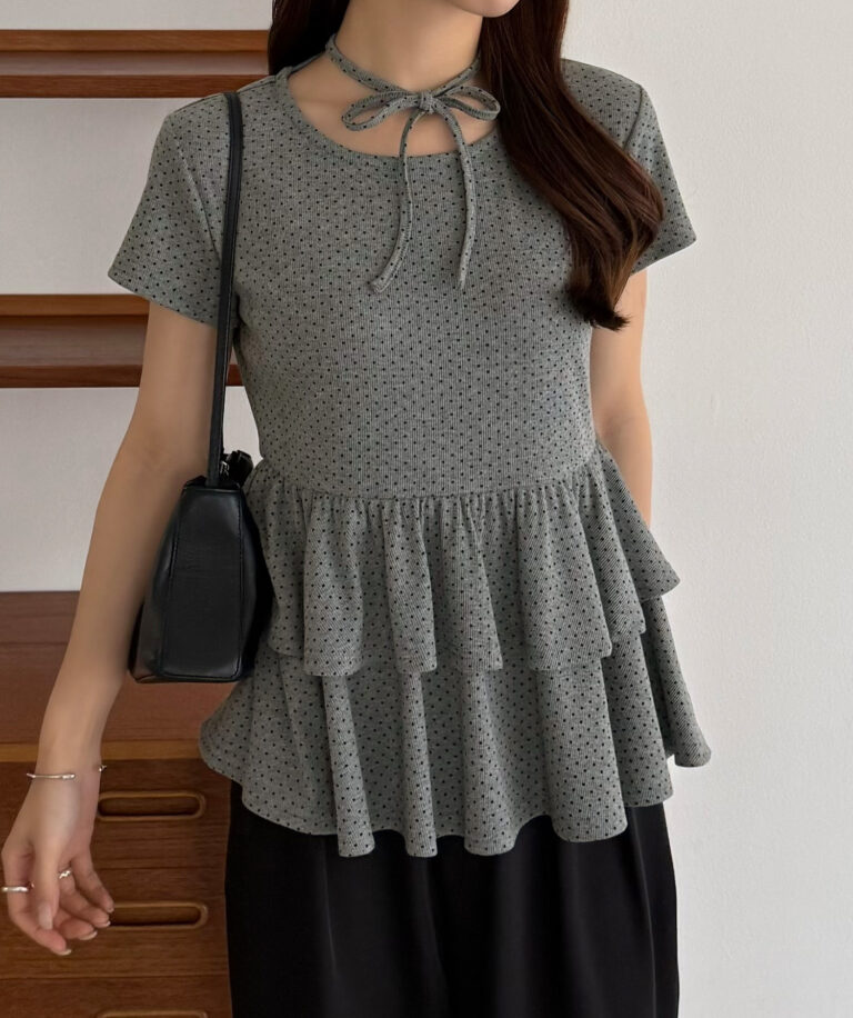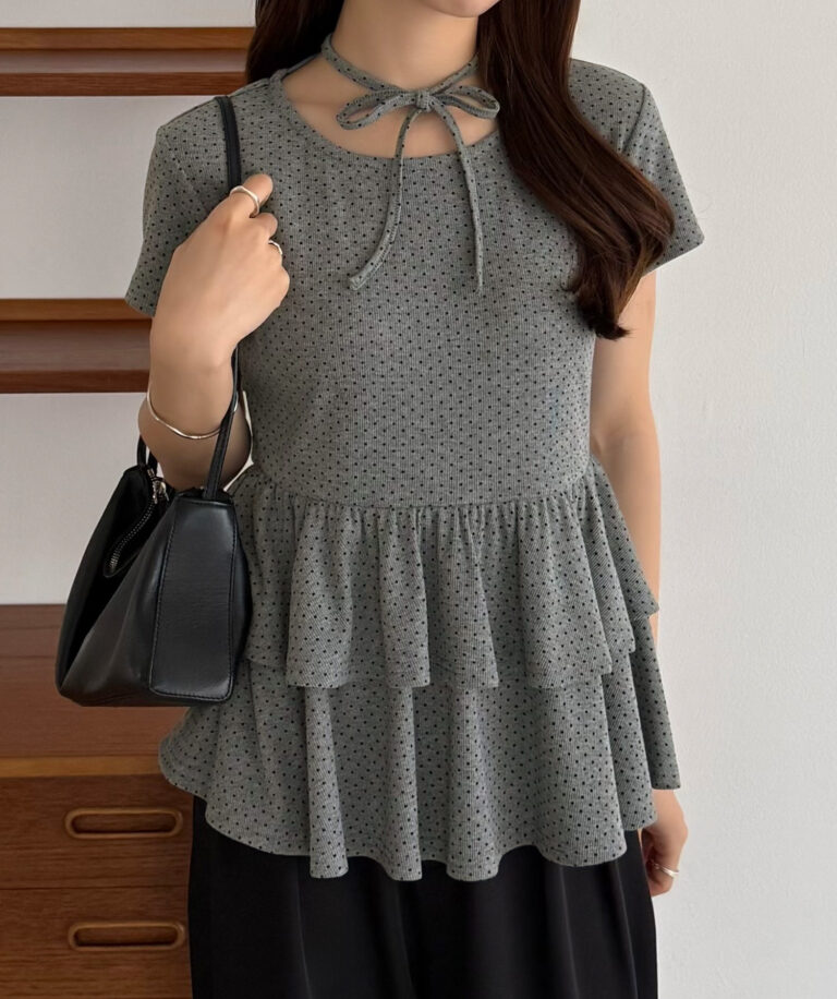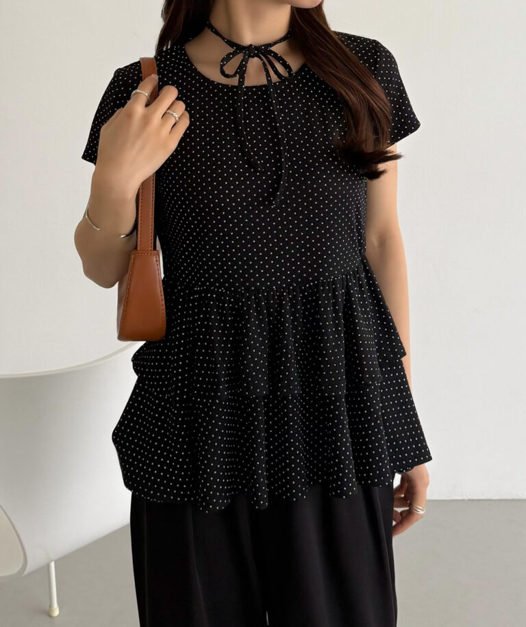 ドット柄が目を惹くリボンティアードトップス。